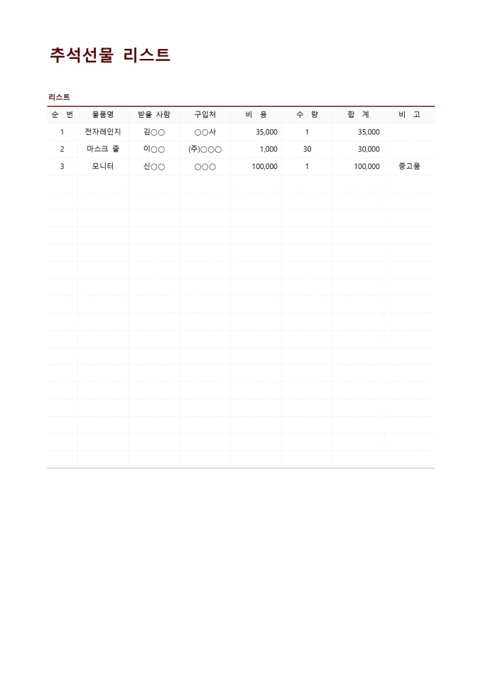 9,000원/월추석선물리스트입니다. 추석에 선물할 리스트를 작성할 때 사용할 수 있는 문서입니다.