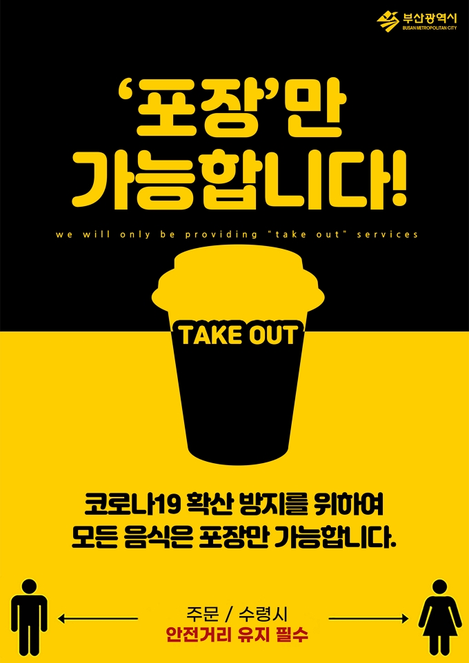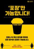 사회적 거리두기 2단계 코로나19 지역사회 확산 방지를 위해 부산시에서 배포하는 실내취식 금지 및 포장가능 안내문입니다.