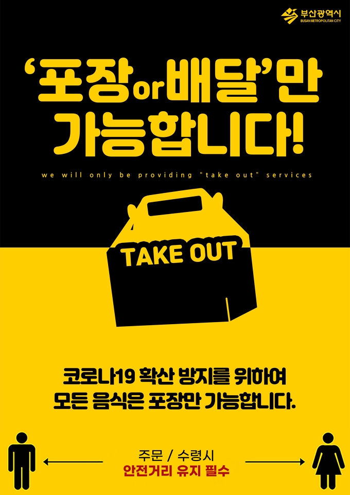 사회적 거리두기 2단계 코로나19 지역사회 확산 방지를 위해 부산시에서 배포하는 실내 취식 금지 및 포장가능 안내문입니다.