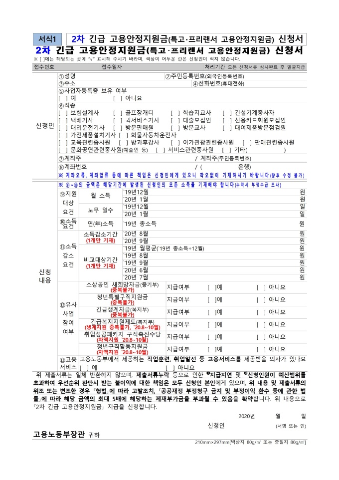 9,000원/월2차로 지원하는 긴급 고용안정지원금(특고・프리랜서 고용안정지원금)신청서입니다.