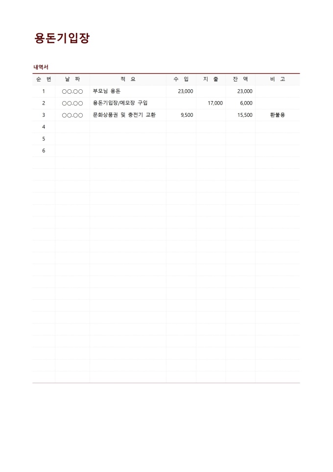 9,000원/월용돈기입장입니다. 용돈의 수입 및 지출과 잔액 내역을 작성할 때 사용할 수 있는 문서입니다.