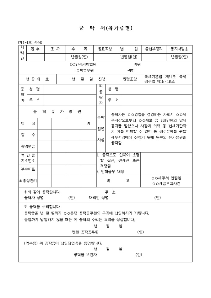 9,000원/월(제1-4호 서식) 국세징수의유예담보공탁서(유가증권) 입니다. 공탁자는 ○○영업을 경영하는 자로서 ○○세무서장으로 부터 ○○세로 금 800만원의 납세통지를 받았으나 사정에 의해 동 납세기한까지 이를 이행할 수 없어 동 징수유예를 관할세무서장에게 신청키 위해 왼쪽의 유가증권을 공탁함. ...