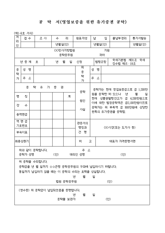 9,000원/월(제1-6호 서식) 상품권법에기한기준일에있어서의법정보증금의부족액공탁서 입니다. 공탁자는 현재 영업보증금으로 금 1, 200만원을 공탁한 바 있으나 년 월 일 현재 상품권발행잔고가 금 4, 200만원으로 이에 대한 법정공탁액은 금2, 100만원이므로 공탁자는 위 부족액 금 900만원에 상당한 왼쪽의 유가증권을 공탁함. ...