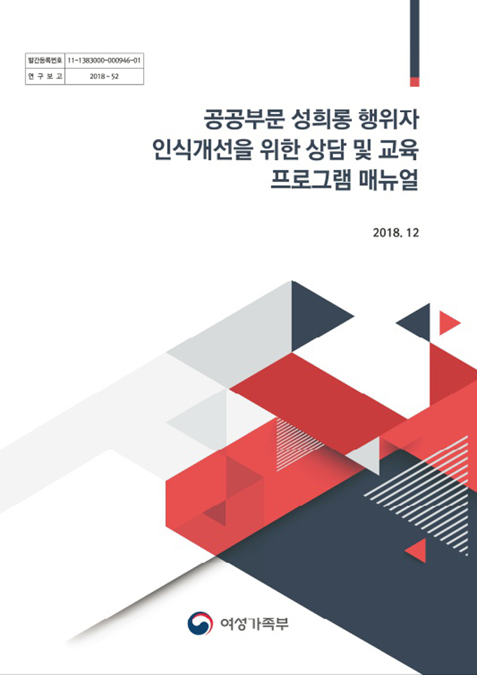 o 자료명 : 공공부문 성희롱 행위자 인식개선을 위한 상담 및 교육 프로그램 매뉴얼 o 교육대상 : 공공기관/일반국민 o 자료내용 : 성희롱 행위자 인식 개선을 위한 프로그램 소개, 프로그램 활용시 유의사항, 회기별 프로그램 진행법(10회기), 참고문헌 o 분량 : 154쪽 o 제작 : 2018년/여성가족부 o 추천콘텐츠(2019년 선정)