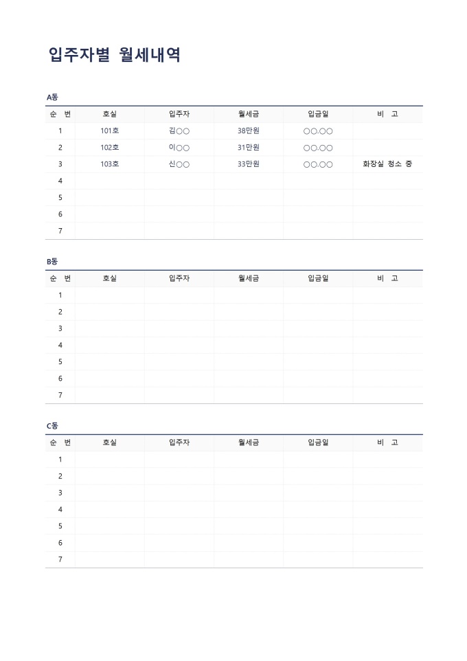 9,000원/월입주자별월세내역입니다. 입주자별로 월세내역을 작성할 때 사용할 수 있는 문서입니다.