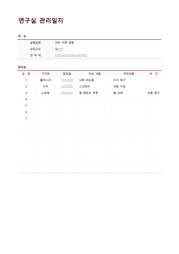 9,000원/월연구실관리일지입니다. 연구실을 관리한 일지를 작성할 때 사용할 수 있는 문서입니다.