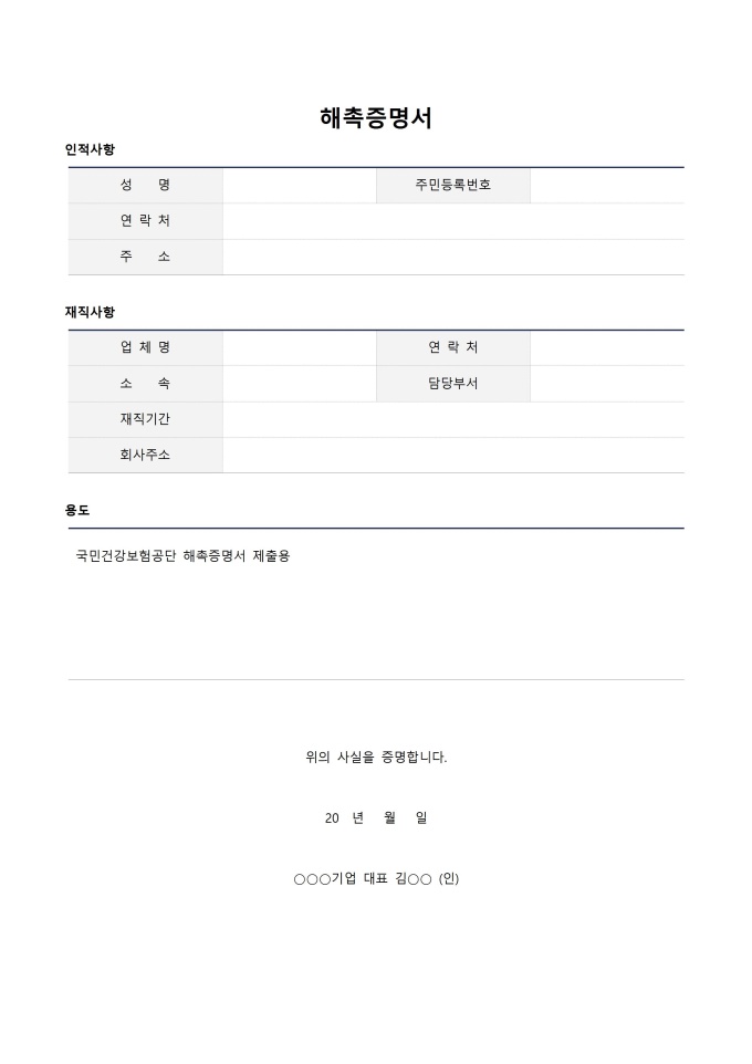 9,000원/월프리랜서가 퇴직 후 국민건강보험공단에 제출하는 해촉증명서입니다.