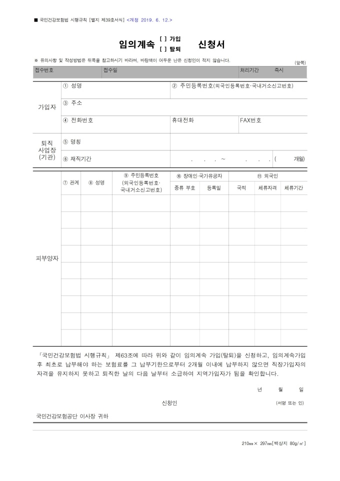 9,000원/월직장 퇴사 후 건강보험료 계속 및 탈퇴 신청서를 작성할 때 사용합니다.
