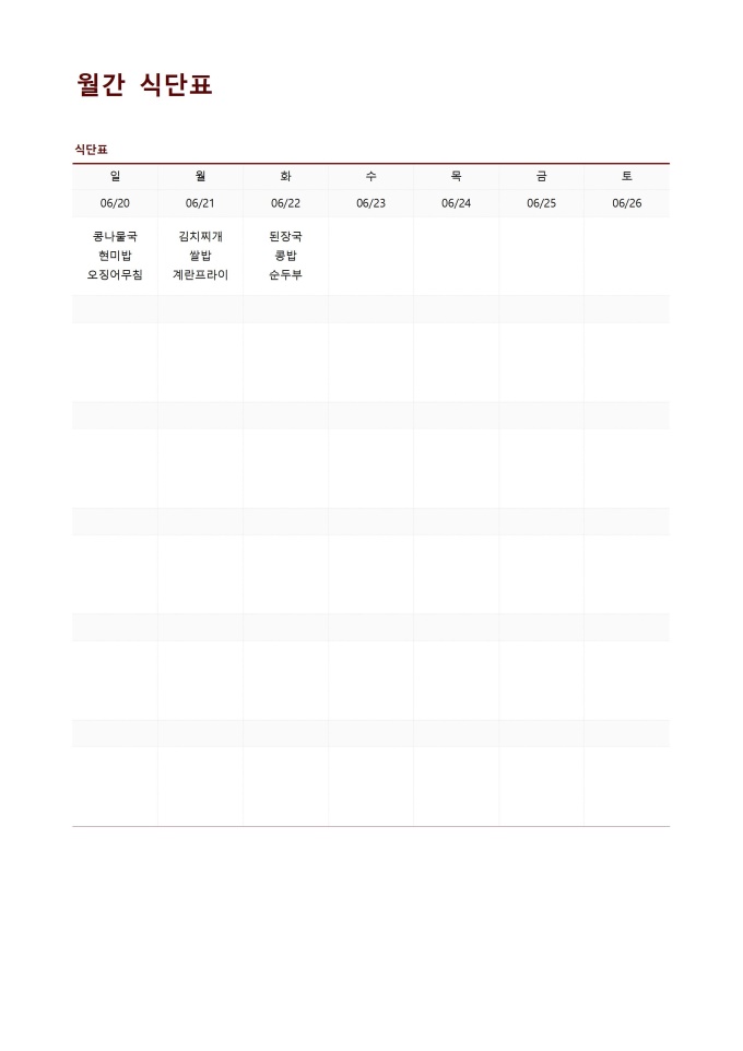 9,000원/월월간식단표입니다. 월간 식단표를 작성할 때 사용할 수 있는 문서입니다.
