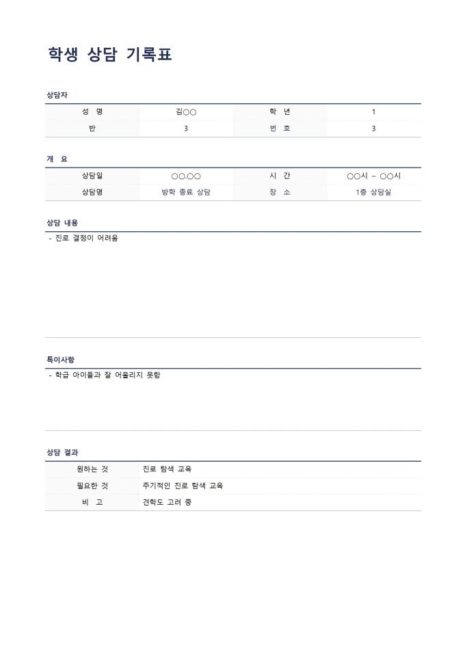 9,000원/월학생상담기록표입니다. 학생과 상담한 기록표를 작성할 때 사용할 수 있는 문서입니다.