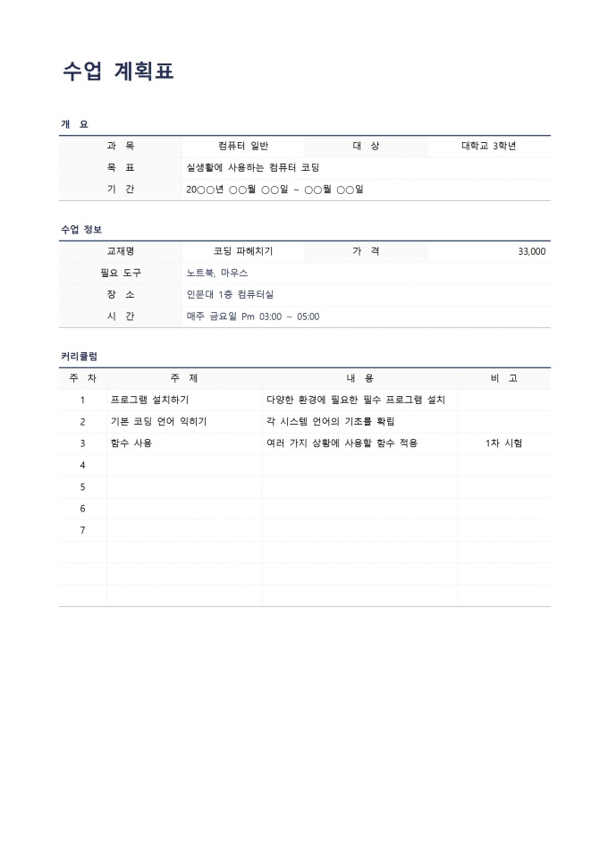 9,000원/월수업계획표입니다.학생을 대상으로 수업 계획표를 작성할 때 사용할 수 있는 문서입니다.