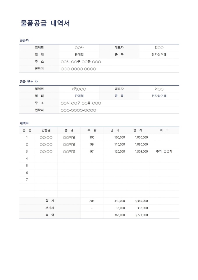 9,000원/월물품공급내역서입니다. 물품공급 내역서를 작성할 때 사용할 수 있는 문서입니다.