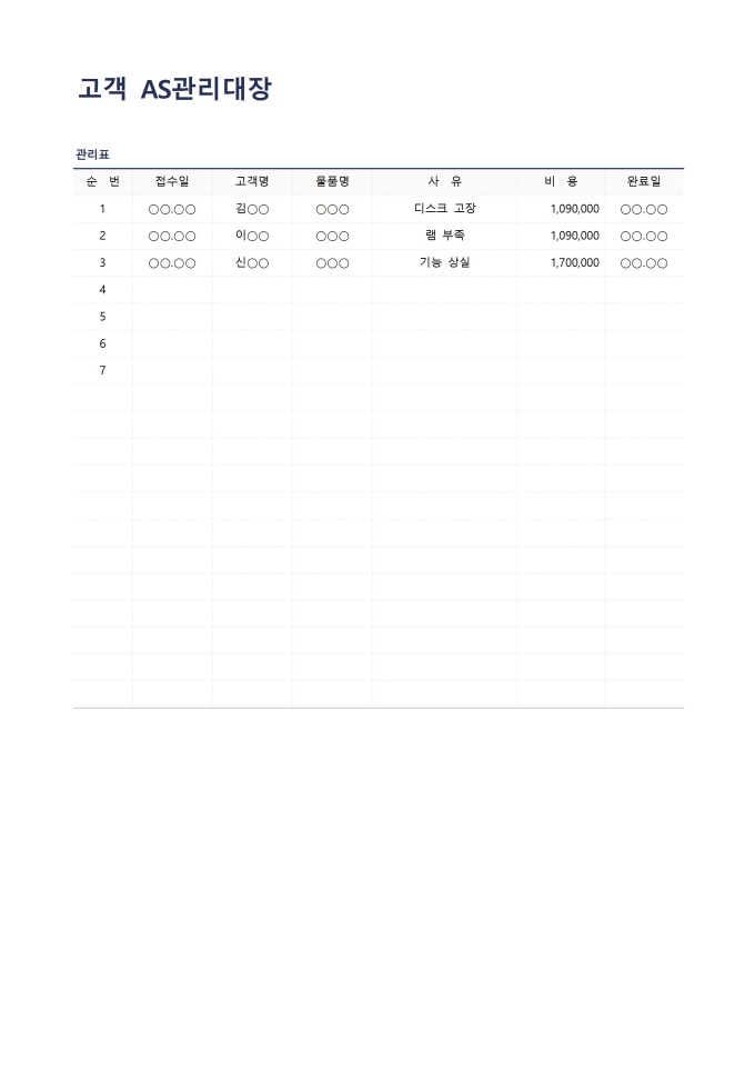 9,000원/월고객AS관리대장입니다. 고객들의 AS관리 대장을 작성할 때 사용할 수 있는 문서입니다.