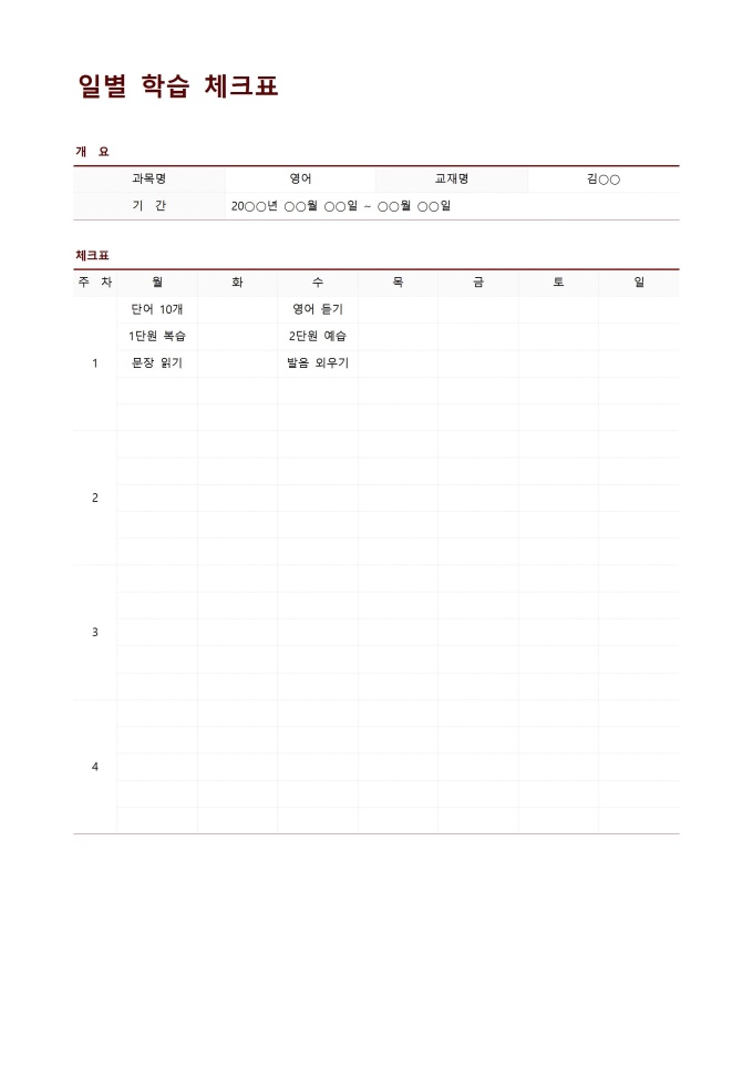 9,000원/월일별학습체크표입니다. 일별로 학습 체크표를 작성할 때 사용할 수 있는 문서입니다.
