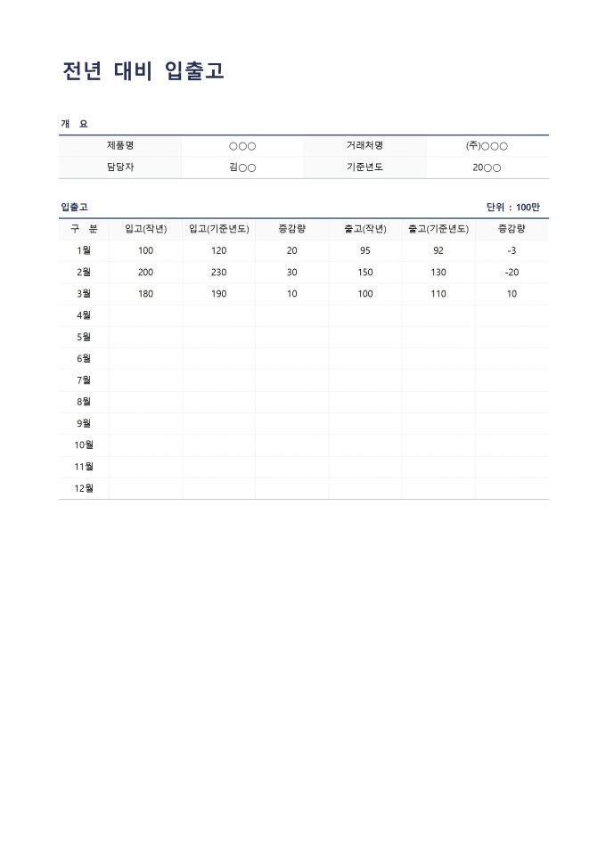 9,000원/월전년대비입출고입니다. 전년대비 입출고 수를 작성할 때 사용할 수 있는 문서입니다.
