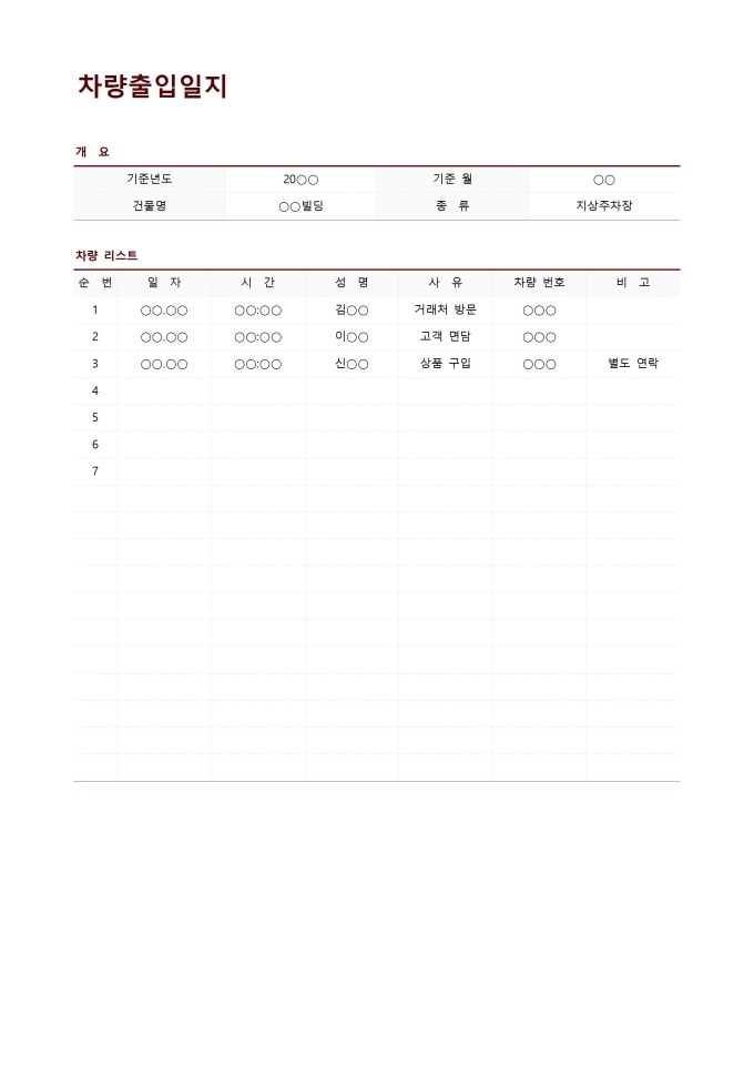9,000원/월차량출입일지입니다. 차량출입한 일지를 작성할 때 사용할 수 있는 문서입니다.