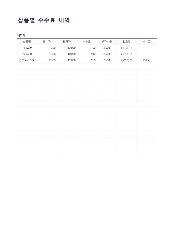 9,000원/월상품별수수료내역입니다. 상품별 수수료 내역을 작성할 때 사용할 수 있는 문서입니다.