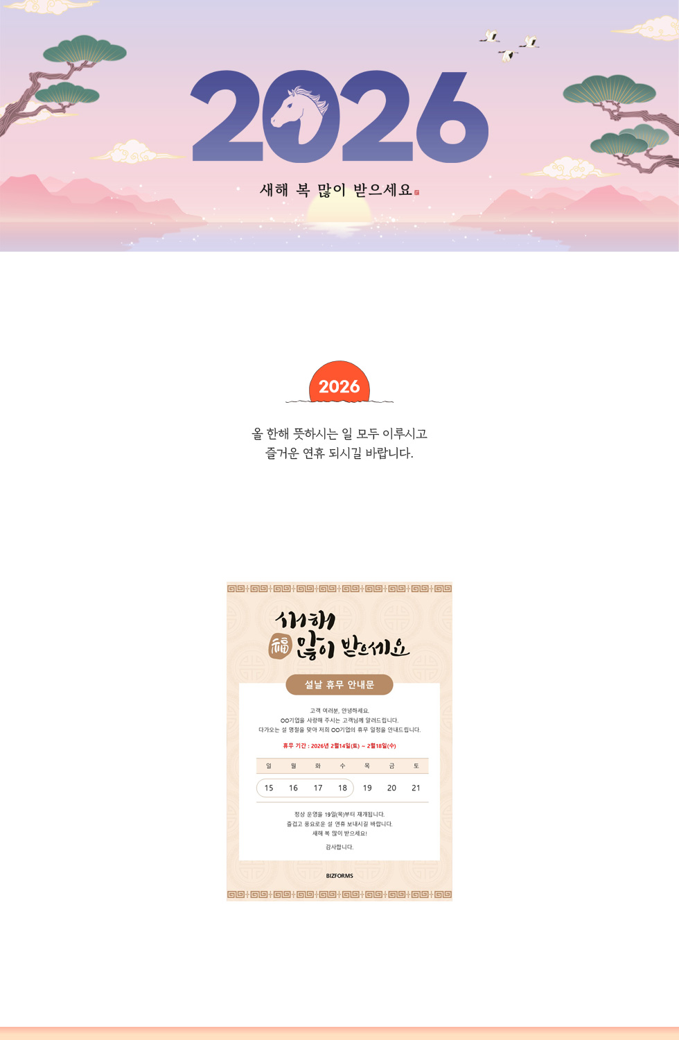 설휴무안내(2026_전통문양)입니다. 차별화된 연휴안내문을 사용해보세요. A4사이즈로 제작되었습니다.