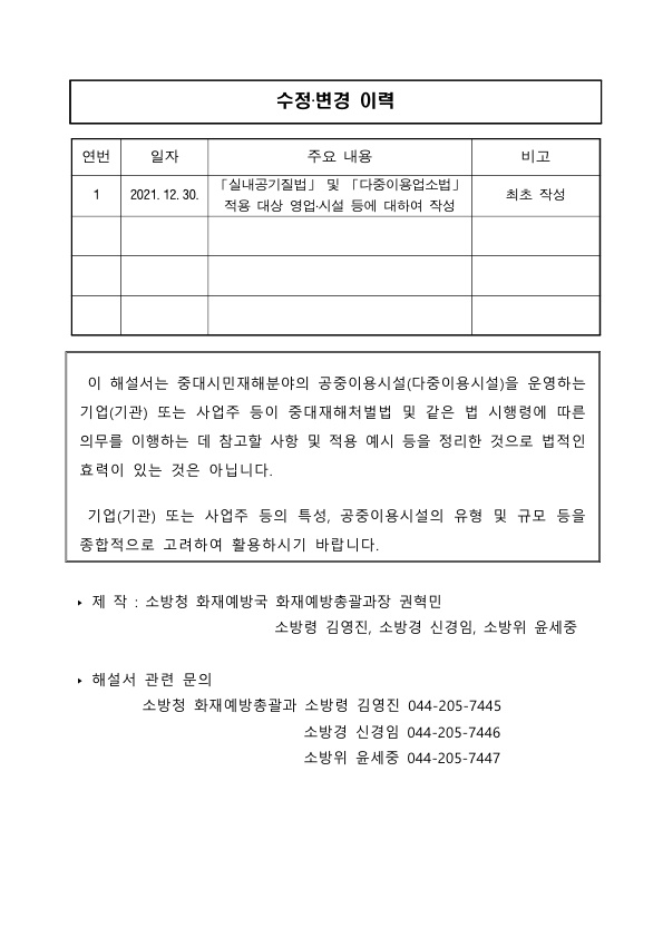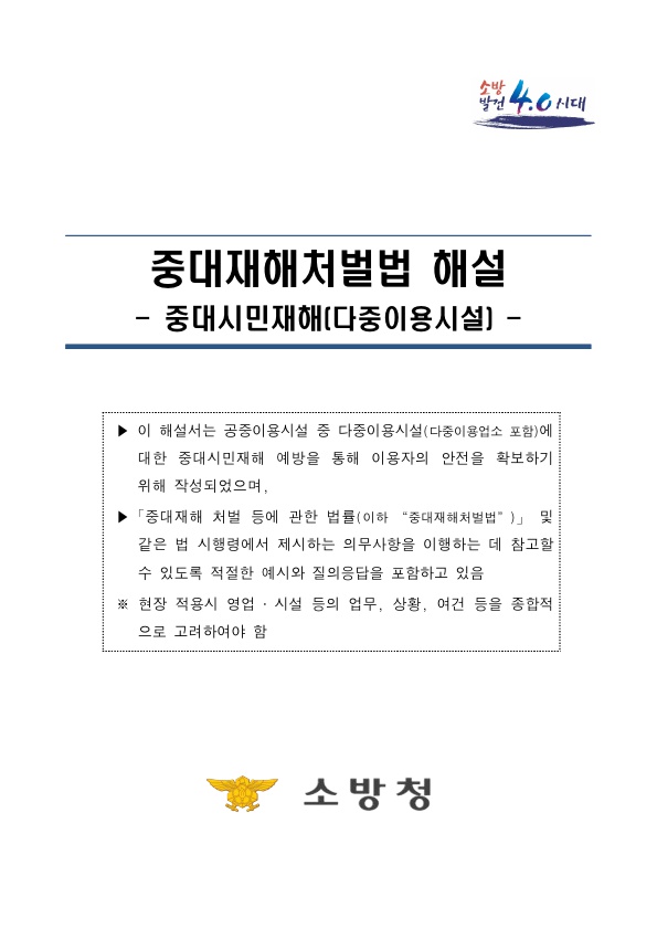 중대재해처벌법 해설입니다. 공중이용시설 중 다중이용시설에 대한 중대시민재해 예방을 통해 안전 확보 및 중대재해 처벌 법률을 참고할 수 있는 문서입니다.