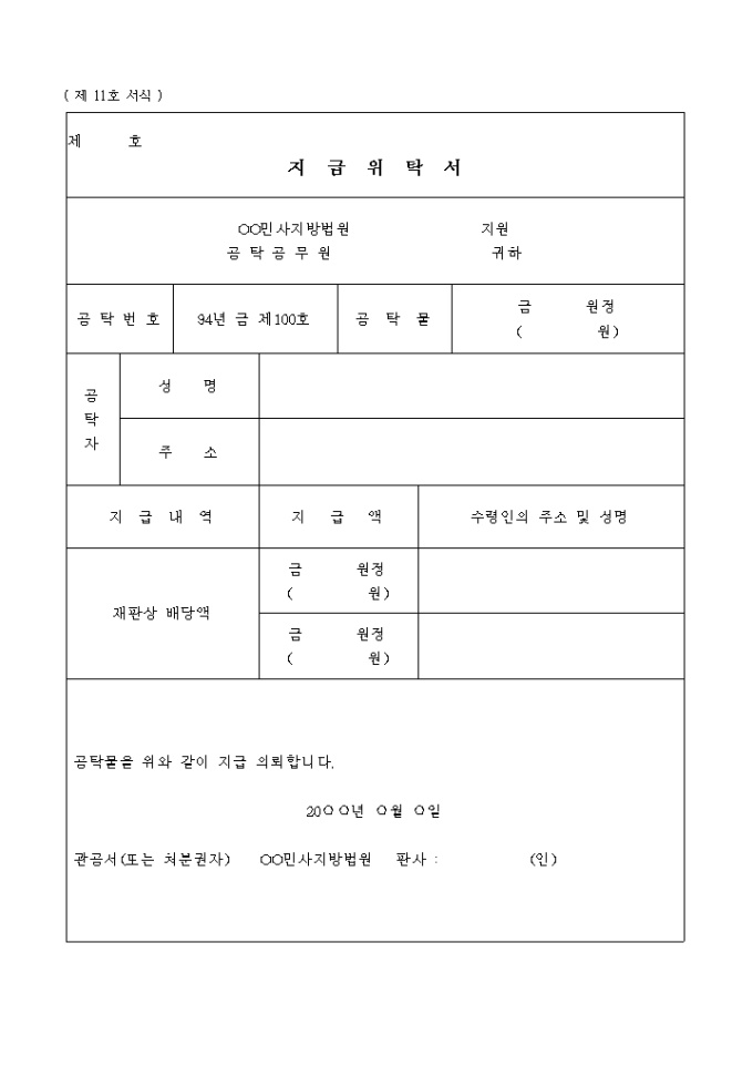 9,000원/월( 제 11호 서식 ) 지급위탁서(분할청구) 입니다. 공탁물을 위와 같이 지급 의뢰합니다. 20 년 월 일 관공서(또는 처분권자) OO민사지방법원 판사 : (인)