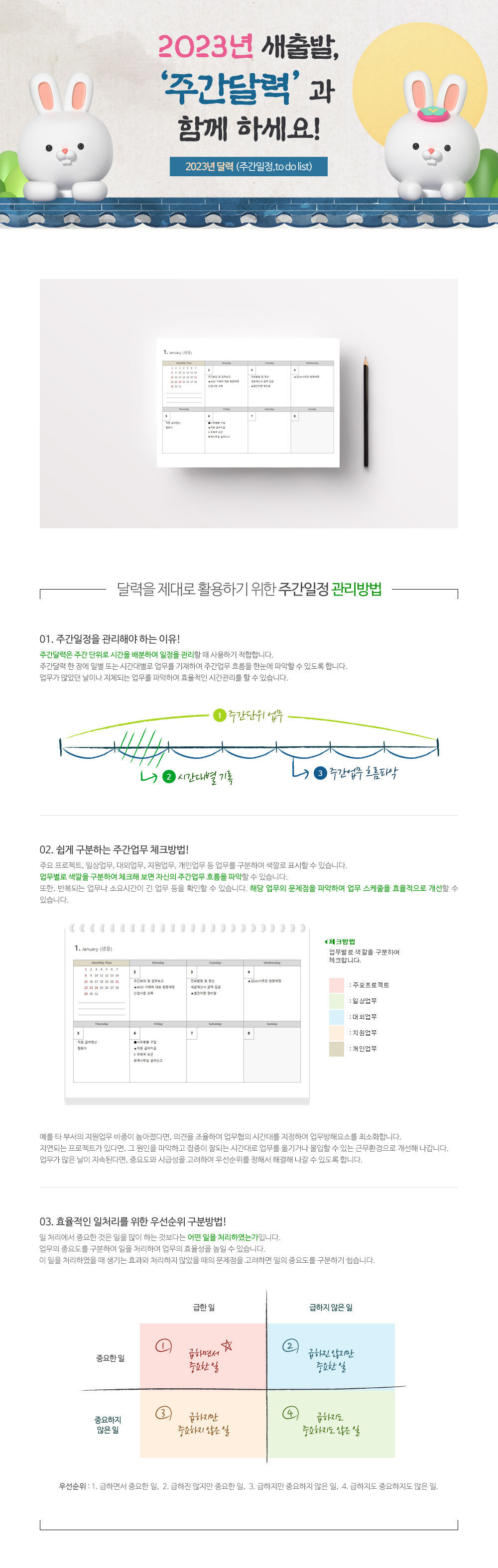2023년 달력입니다. 월별 Plan 및 주간일정을 관리하시는데 편리하도록 제작하였습니다.