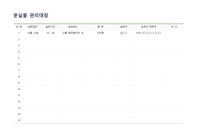 9,000원/월분실물 관리대장입니다. 분실물 관리대장을 작성할 때 사용할 수 있는 문서입니다.