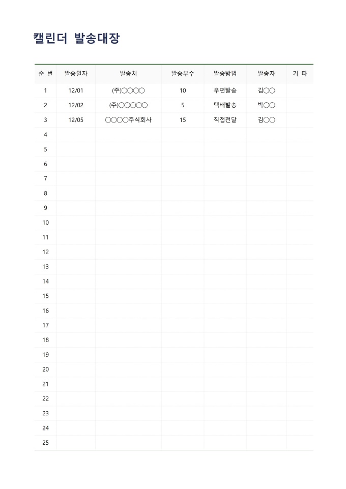 캘린더 발송대장 입니다. 캘린더 발송대장을 작성할 때 사용할 수 있는 문서입니다.
