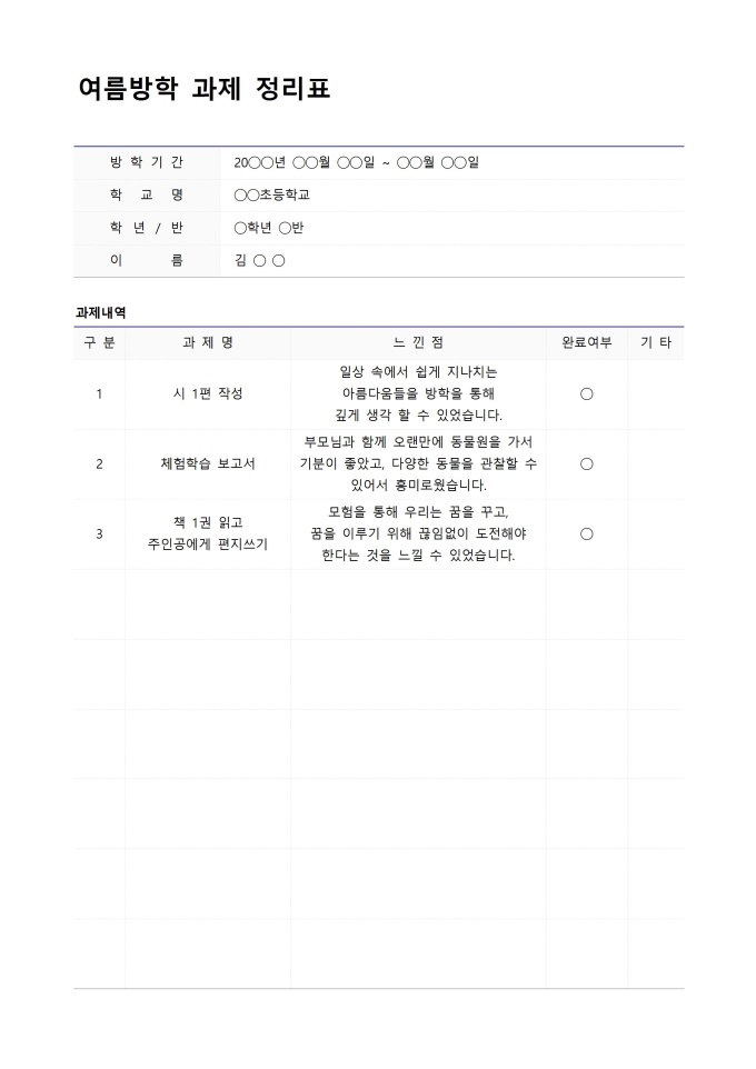 9,000원/월여름방학 과제 정리표입니다. 여름방학 과제 정리표를 작성할 때 사용할 수 있는 문서입니다.