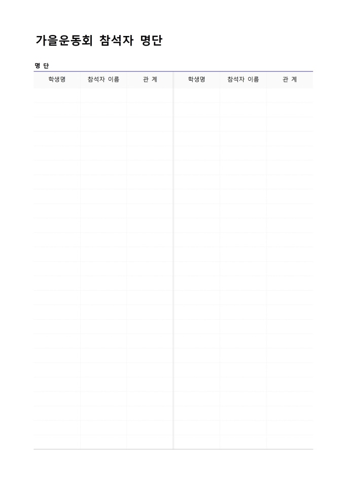 9,000원/월가을운동회 참석자 명단입니다. 어린이집이나 유치원 등에서 가을운동회 참석자 명단를 작성할 때 사용할 수 있는 문서입니다.