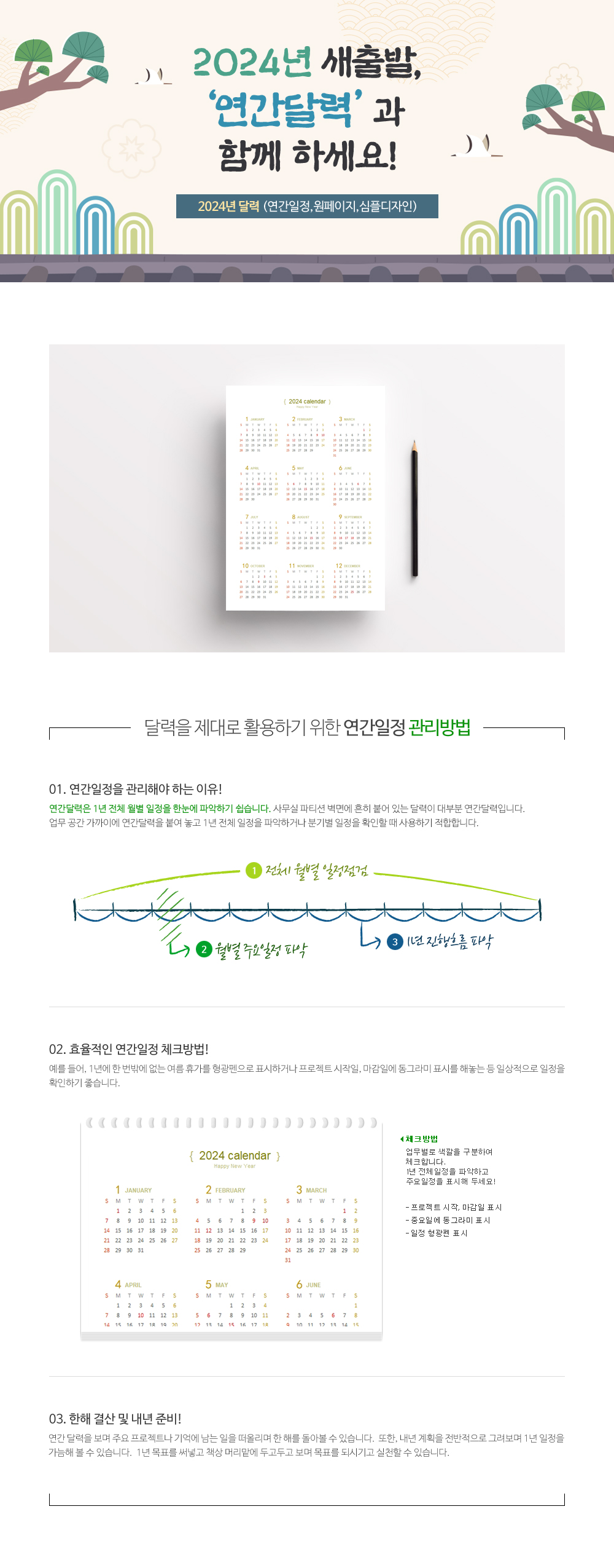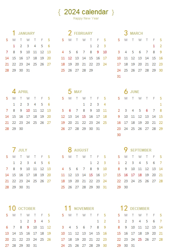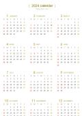 2024년 달력입니다. 화이트배경의 심플한 디자인을 활용하여 원페이지로 제작하였습니다. 연간일정을 관리하시는데 유용하실거 같습니다.