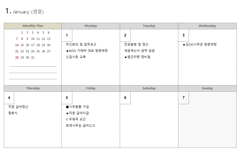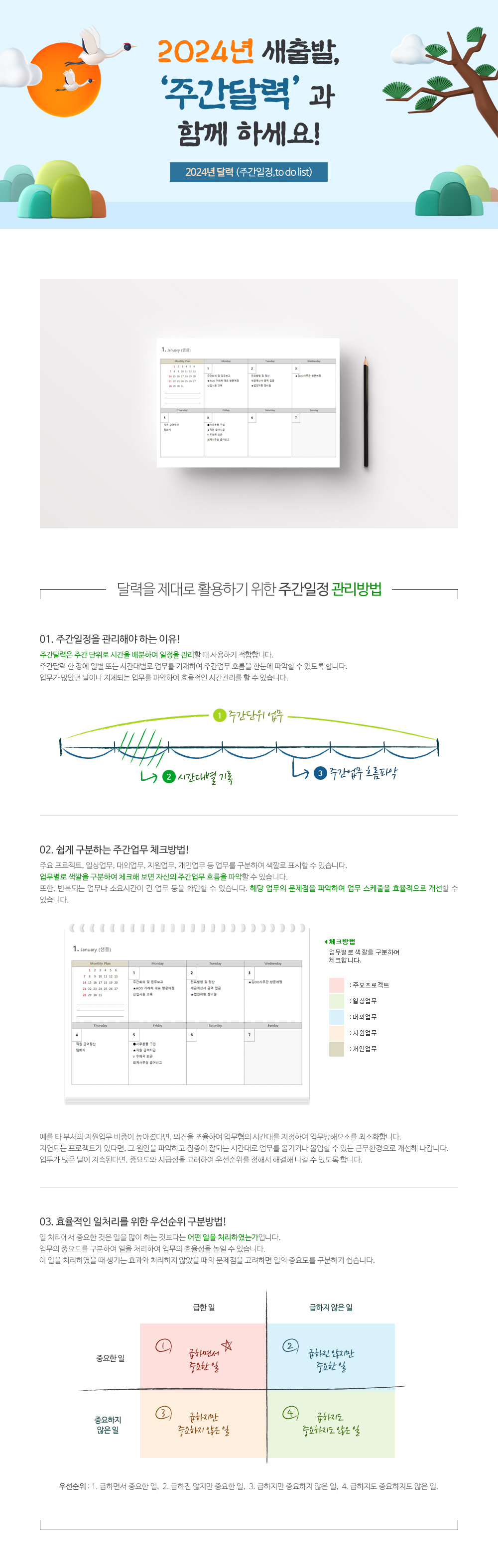 2024년 달력입니다. 월별 Plan 및 주간일정을 관리하시는데 편리하도록 제작하였습니다.