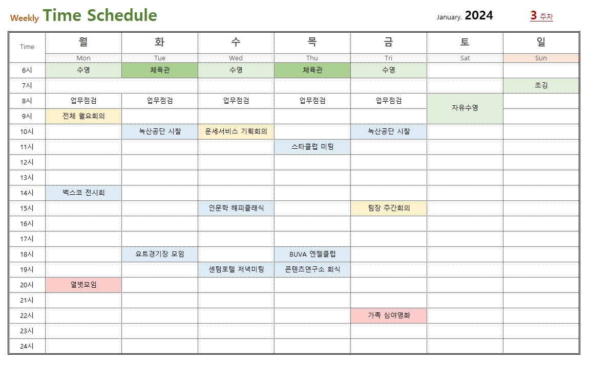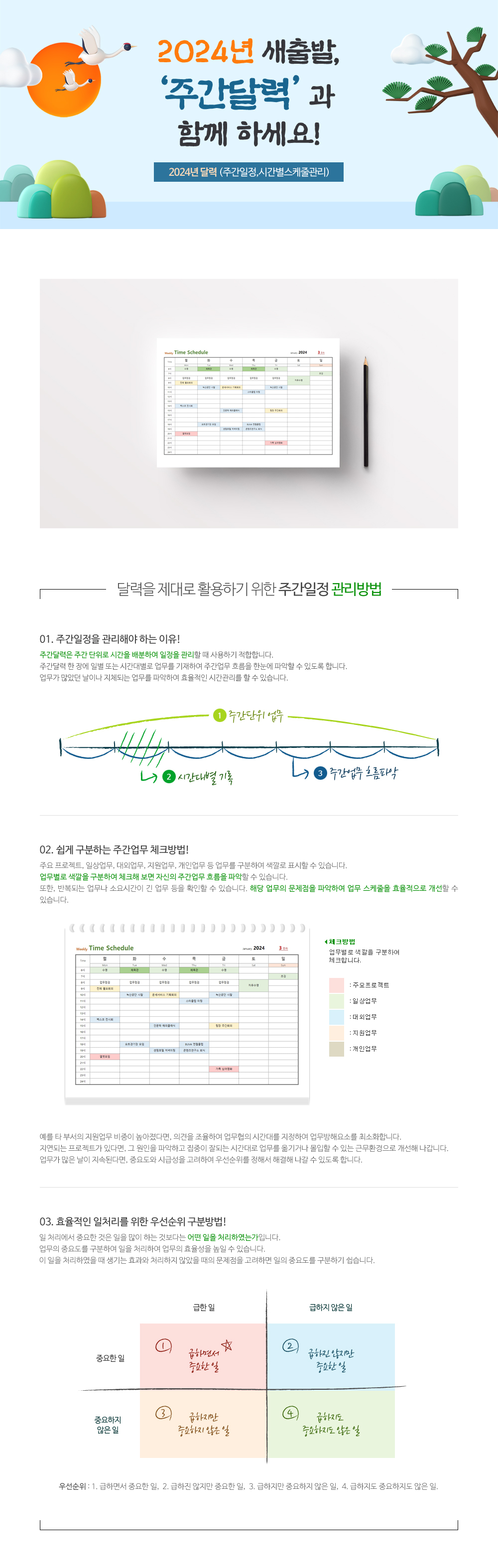 2024년 달력입니다. 원페이지로 제작되어 주간 일정을 시간대별로 관리하실 수 있습니다.