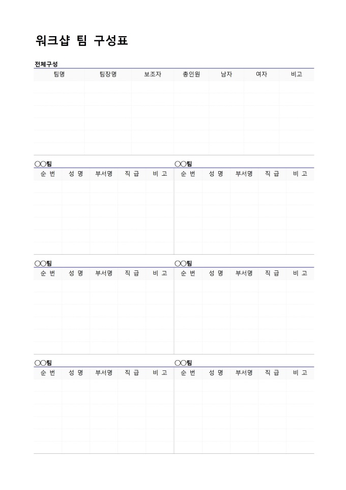 9,000원/월워크샵 팀 구성표입니다. 워크샵 팀 구성표를 작성할 때 사용할 수 있는 문서입니다.