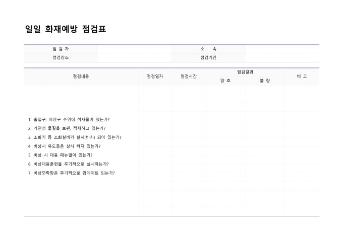 9,000원/월일일 화재예방 점검표입니다. 일일 화재예방 점검표를 작성할 때 사용할 수 있는 문서입니다.