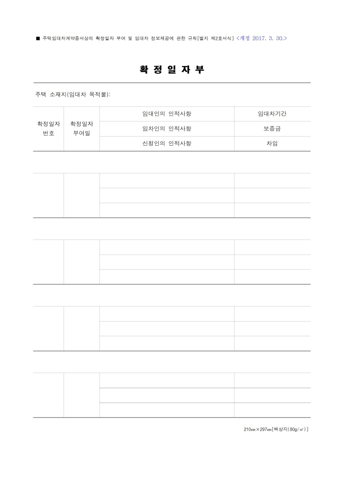 9,000원/월확정일자부 서식입니다. 주택임대차계약증서상의 확정일자 부여 및 임대차 정보제공에 관한 규칙 [별지 제2호서식] 입니다.