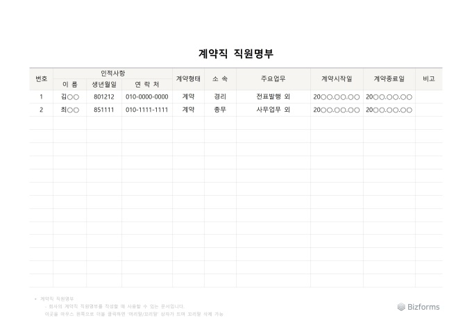 9,000원/월계약직 직원명부입니다. 회사에서 계약직 직원명부를 작성할 때 사용할 수 있는 서식입니다.