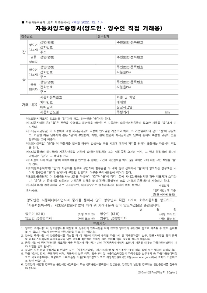 9,000원/월자동차양도증명서(양도인ㆍ양수인 직접 거래용) 서식입니다. 자동차매매사업자의 중개를 통하지 않고 양도인-양수인과 직접 거래로 소유자동차를 양도하고, 「자동차등록규칙」 제33조제2항제1호에 따라 거래내용과 같이 양도하였음을 증명하기 위한 서식입니다. [별지 제15호서식]