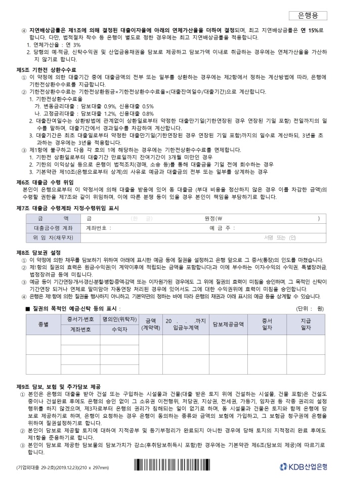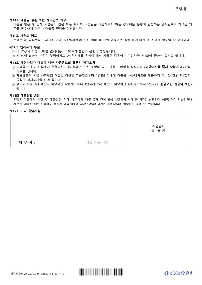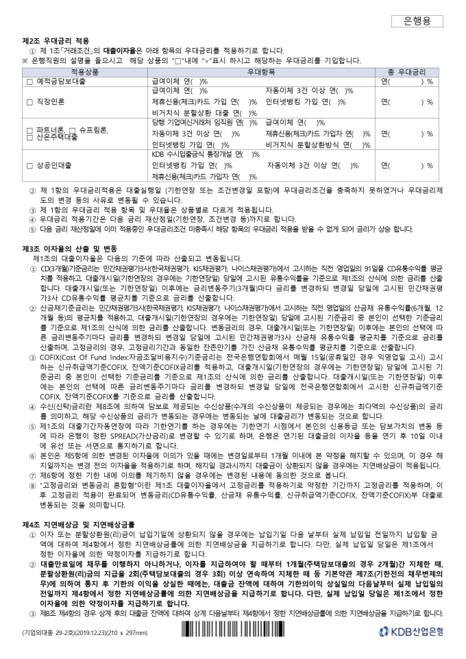 9,000원/월대출거래약정서(개별거래대출용) 서식입니다. 한국산업은행(이하 '은행'이라 한다)과 조건에 따라 대출거래를 함에 있어 은행여신거래기본약관(가계용)이 적용됨을 승인하고, 이 약정서상의 각 조항을 확약 하고자 사용하는 서식입니다.