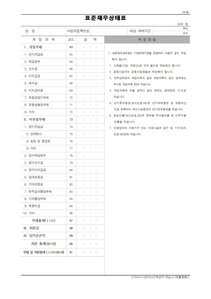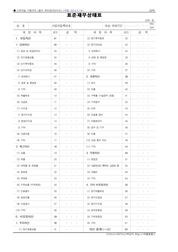 9,000원/월표준재무상태표 서식입니다. 소득세법 시행규칙 [별지 제40호의6서식] 입니다. 2014. 3. 14 개정