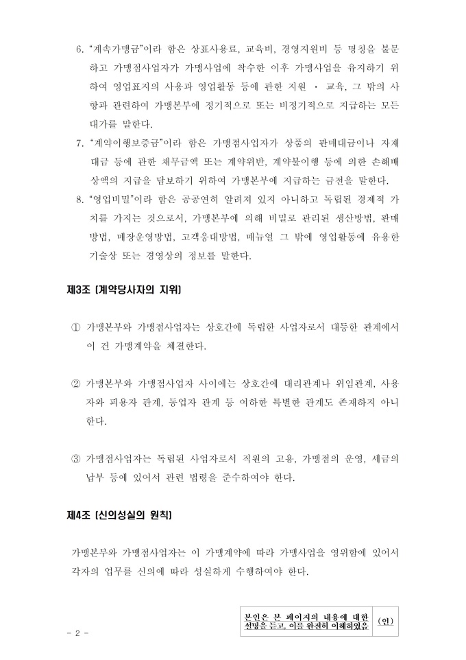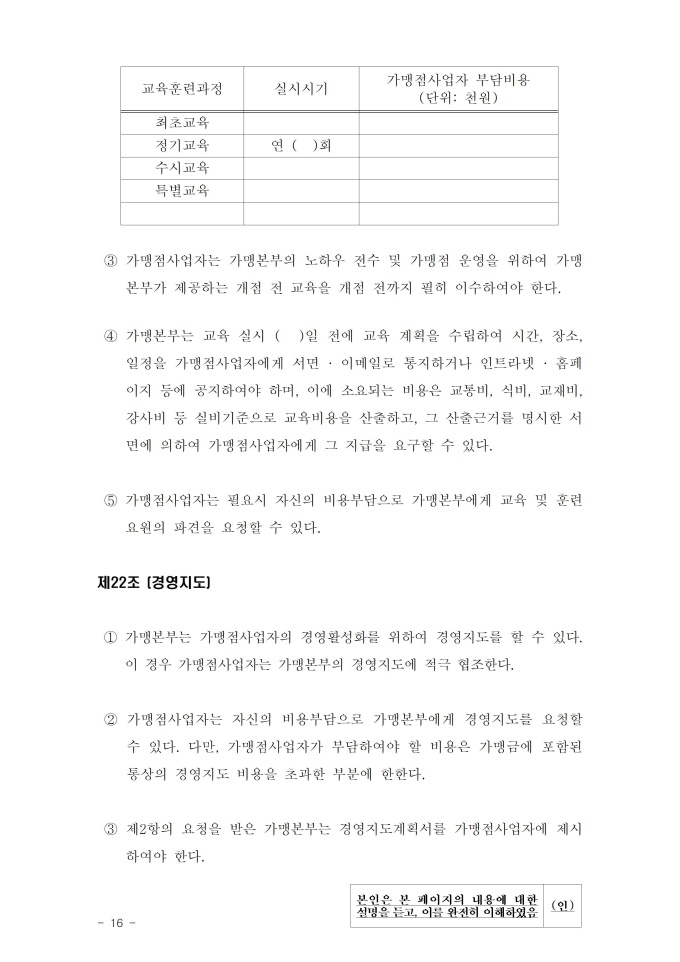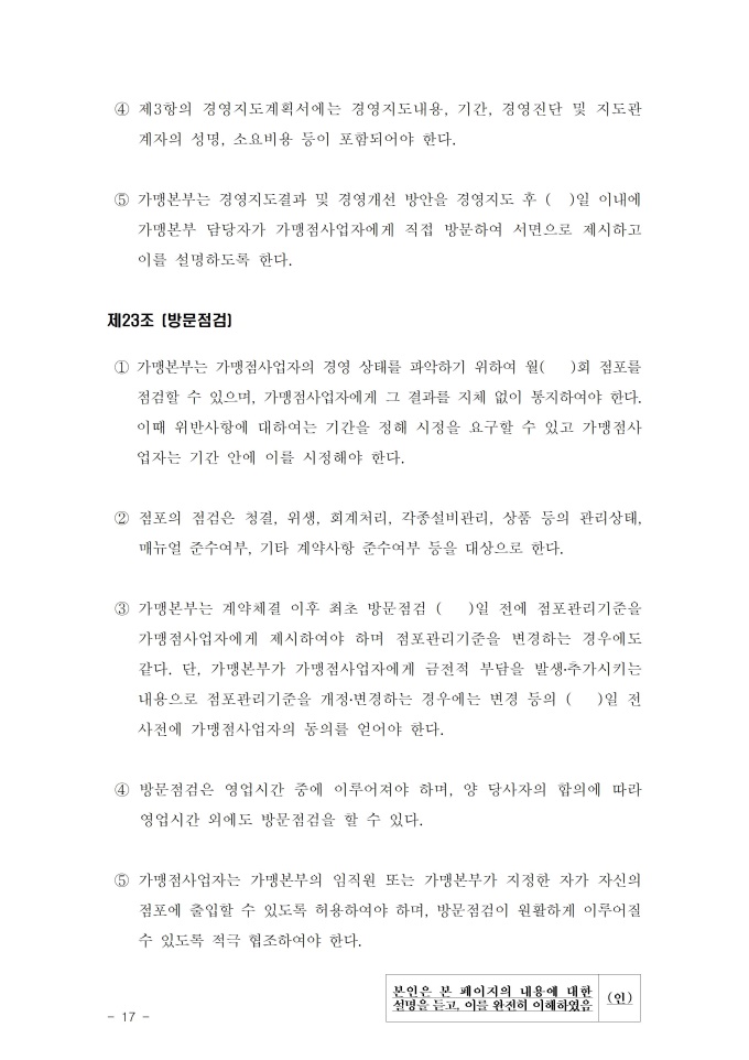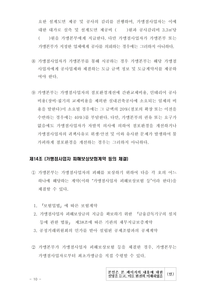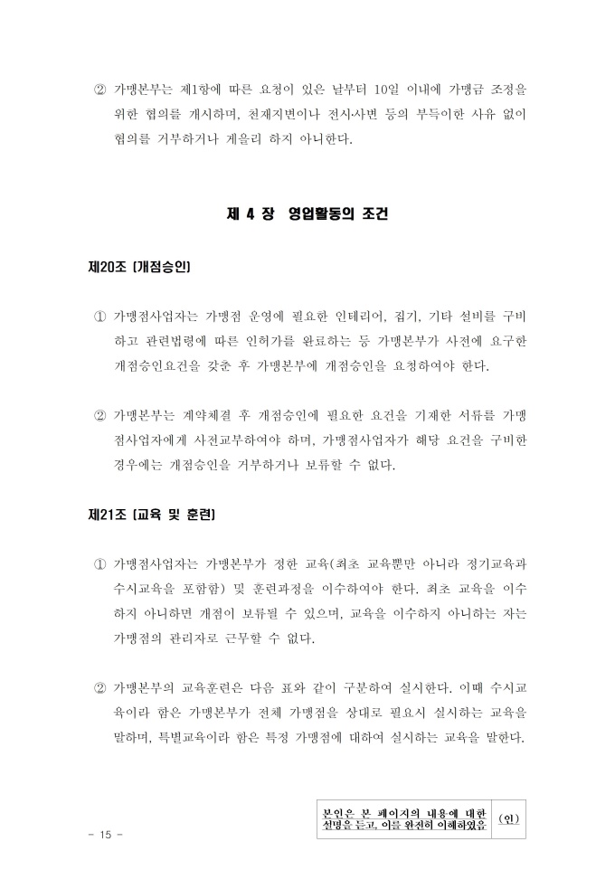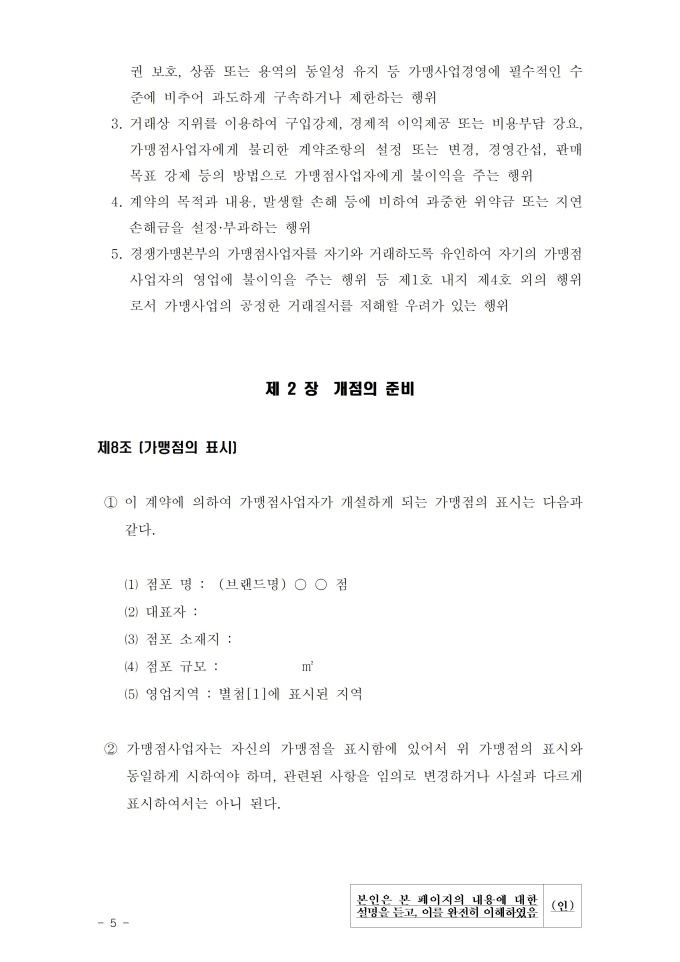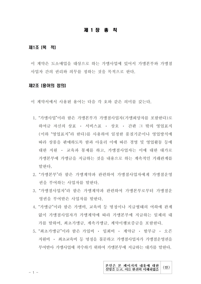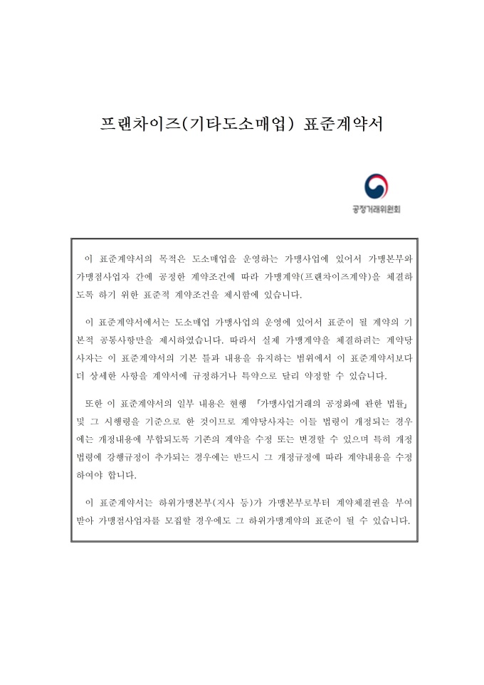 공정거래위원회는 가맹사업법 제11조 제4항의 규정에 따라 건전한 가맹사업거래질서를 확립하고 불공정한 내용의 가맹계약이 통용되는 것을 방지하기 위해 표준가맹계약서를 개정하여 그 사용을 적극 권장하고 있으니, 가맹계약서 작성 시 도입하여 활용하시기 바랍니다. [2023. 1 개정]