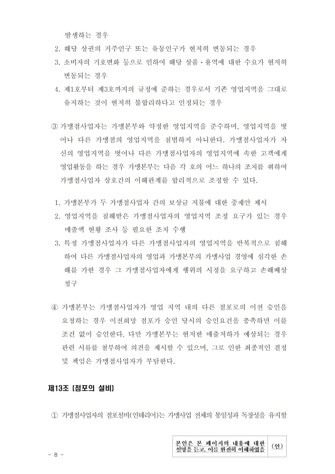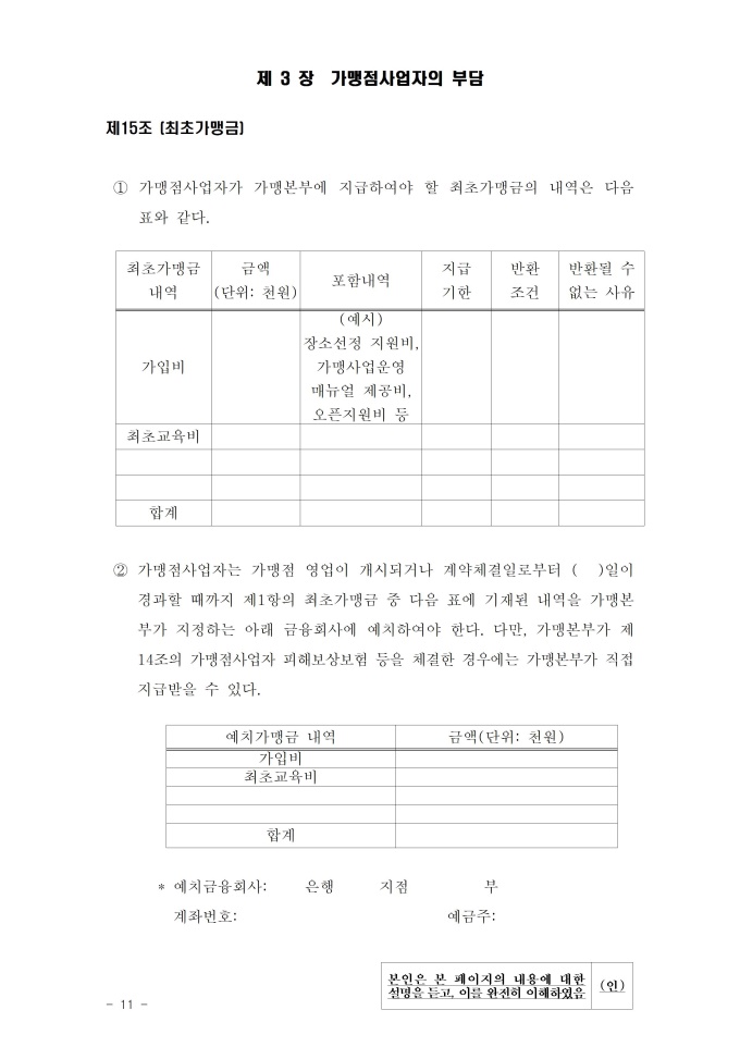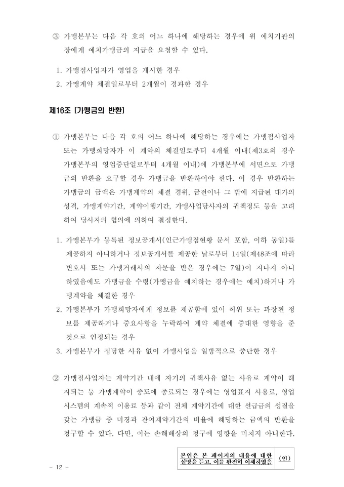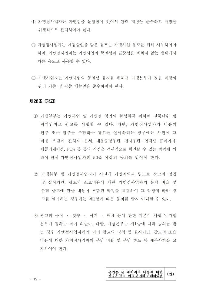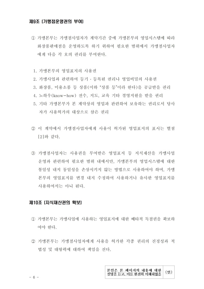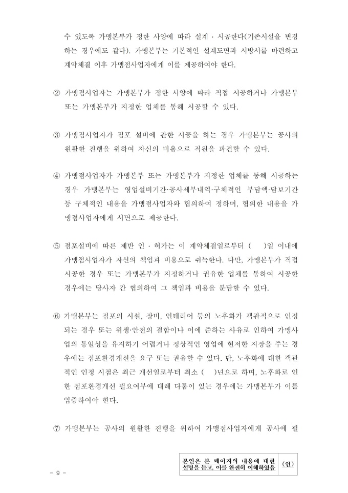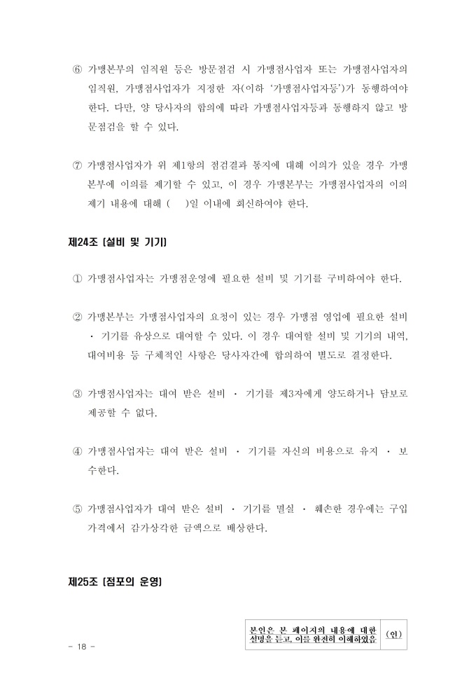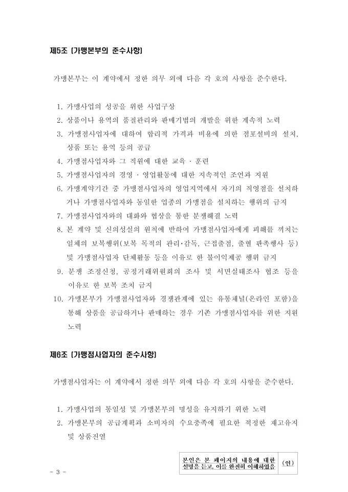 공정거래위원회는 가맹사업법 제11조 제4항의 규정에 따라 건전한 가맹사업거래질서를 확립하고 불공정한 내용의 가맹계약이 통용되는 것을 방지하기 위해 표준가맹계약서를 개정하여 그 사용을 적극 권장하고 있으니, 가맹계약서 작성 시 도입하여 활용하시기 바랍니다. [2023. 1 개정]