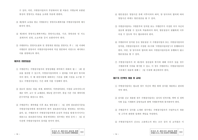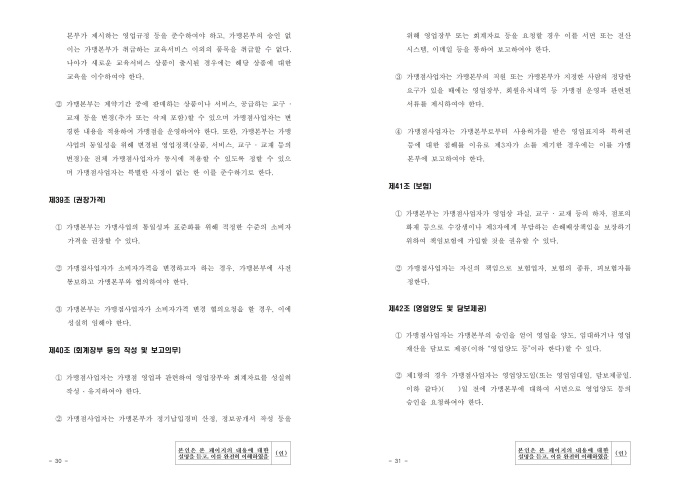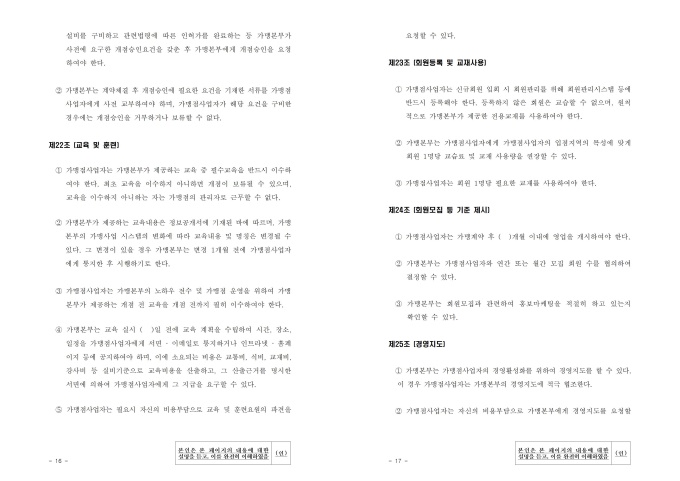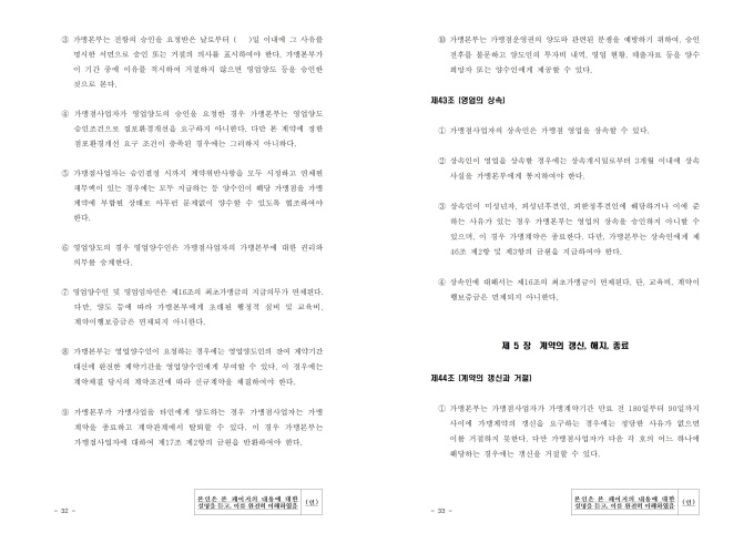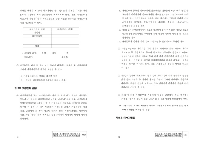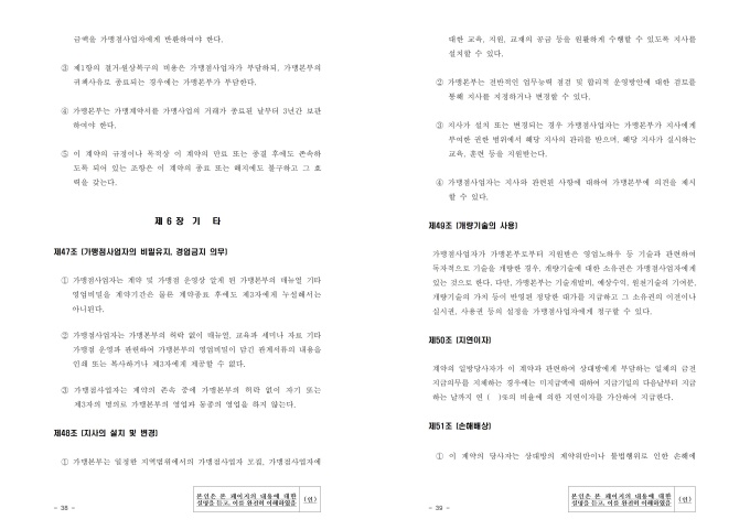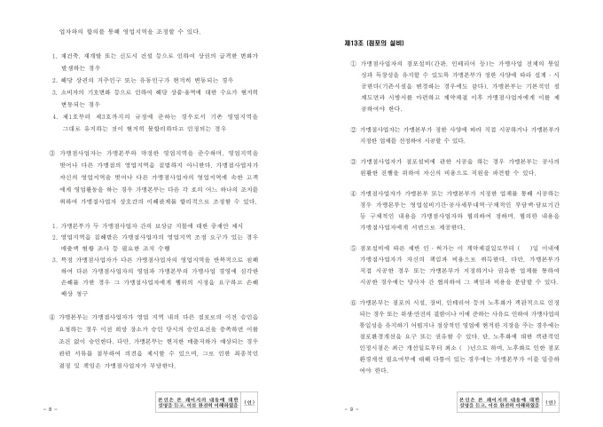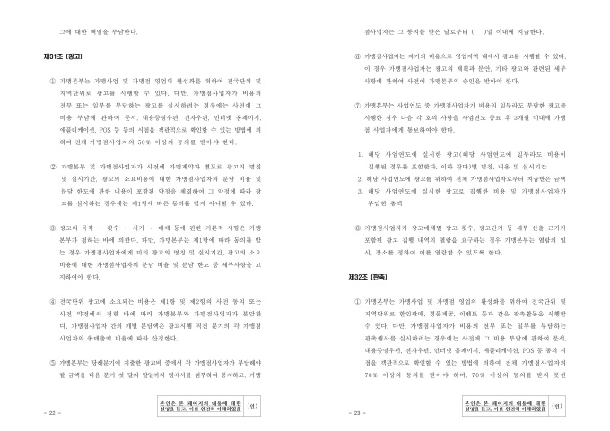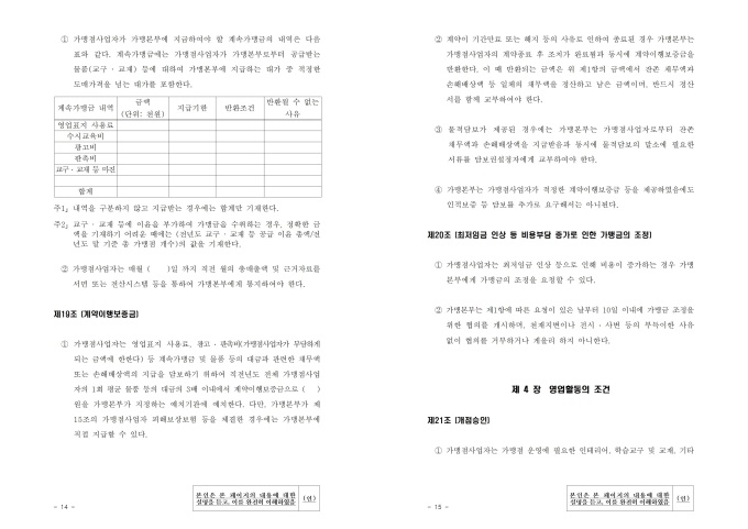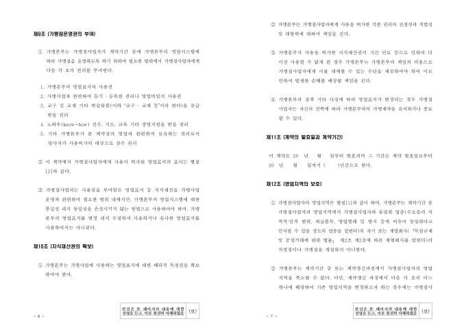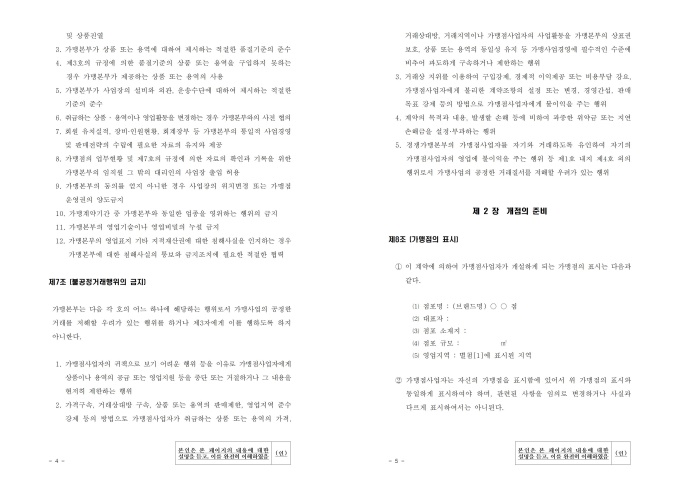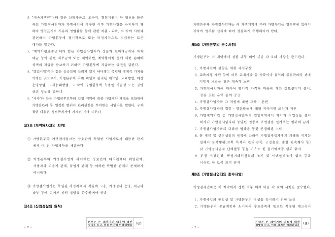 공정거래위원회는 가맹사업법 제11조 제4항의 규정에 따라 건전한 가맹사업거래질서를 확립하고 불공정한 내용의 가맹계약이 통용되는 것을 방지하기 위해 표준가맹계약서를 개정하여 그 사용을 적극 권장하고 있으니, 가맹계약서 작성 시 도입하여 활용하시기 바랍니다. [2023. 1 개정]