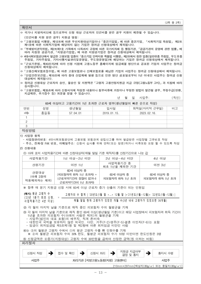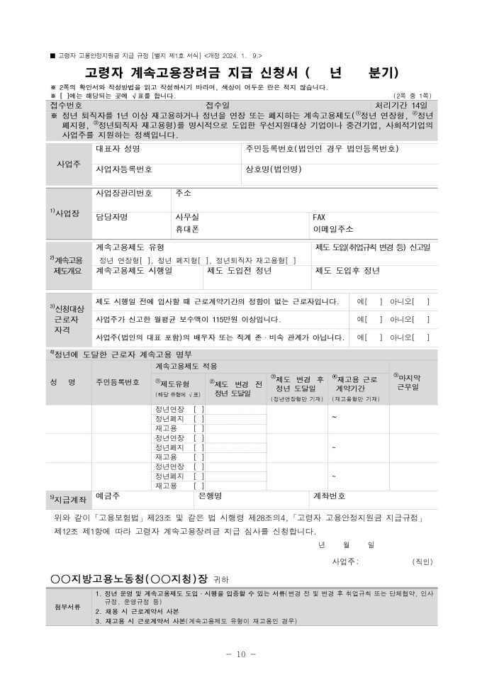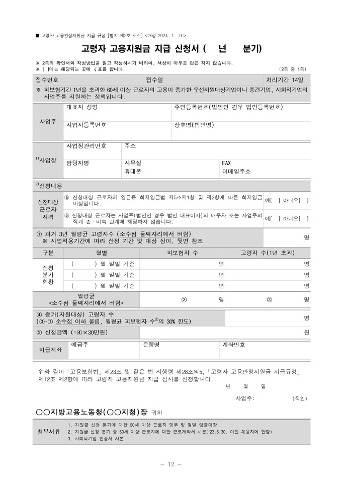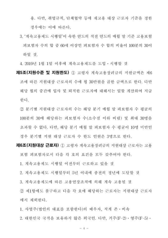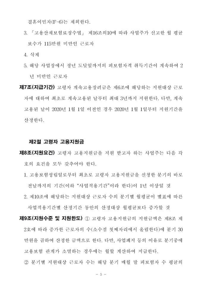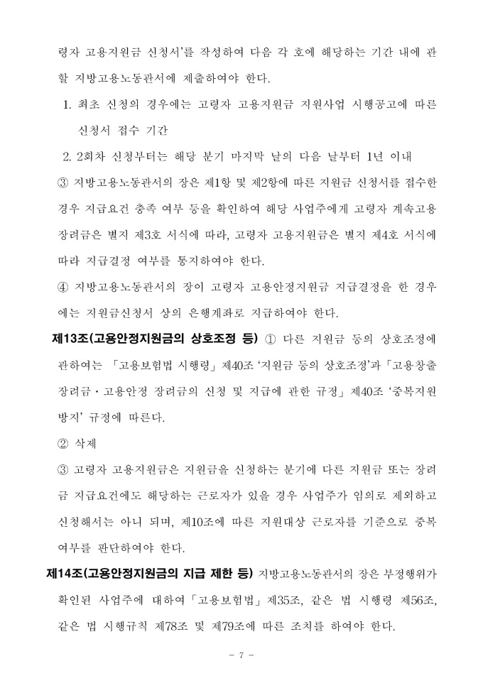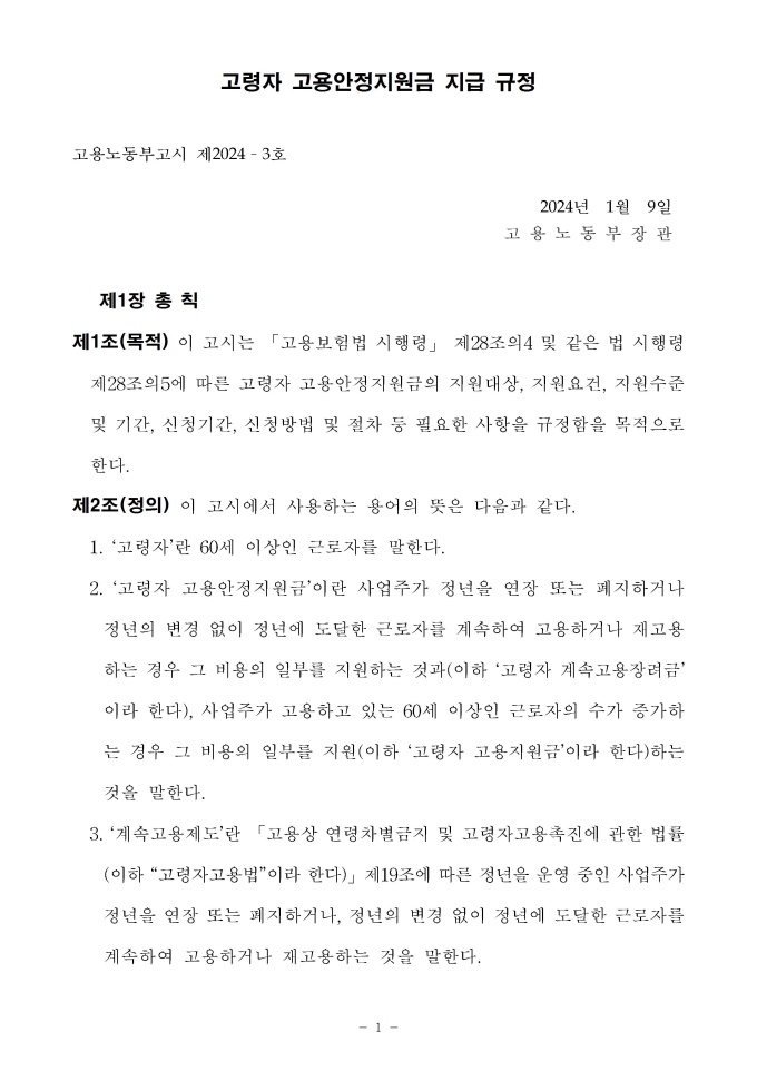 9,000원/월고령자 고용안정지원금 지급 규정 개정 전문입니다. 이 고시는 「고용보험법 시행령」 제28조의4 및 같은 법 시행령 제28조의5에 따른 고령자 고용안정지원금의 지원대상, 지원요건, 지원수준 및 기간, 신청방법 및 절차 등 필요한 사항을 규정함을 목적으로 합니다.