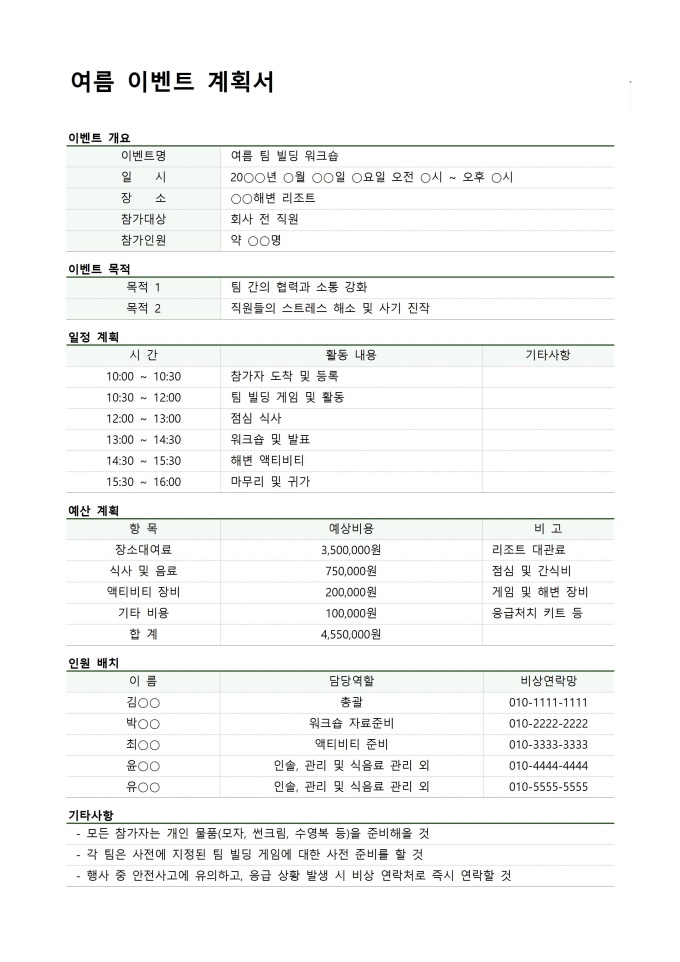 9,000원/월여름 이벤트 계획서 서식입니다. 여름 이벤트 계획서는 여름철에 진행되는 이벤트를 체계적으로 계획하고 관리하기 위한 문서입니다. 이를 통해 이벤트의 목적, 일정, 예산 등을 명확히 하고, 성공적인 행사를 진행할 수 있도록 도와줍니다.
