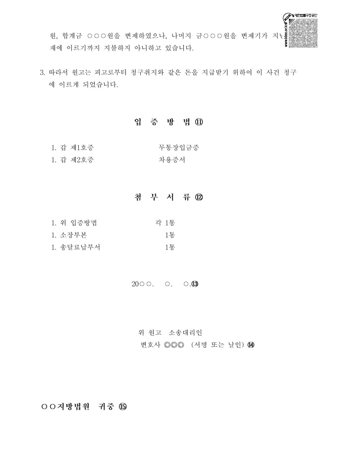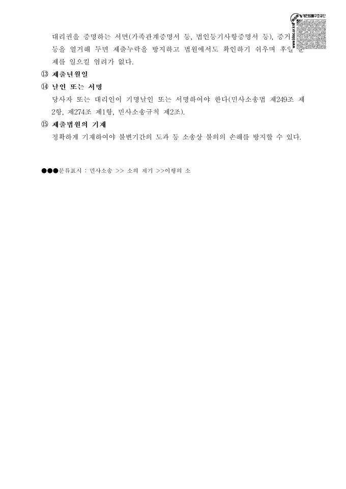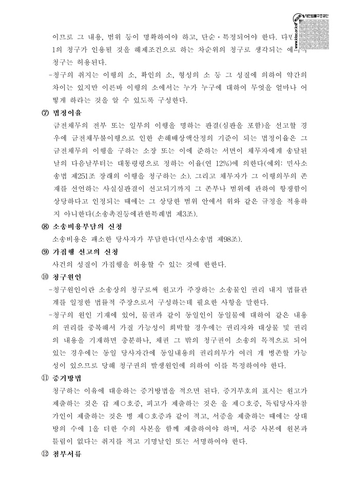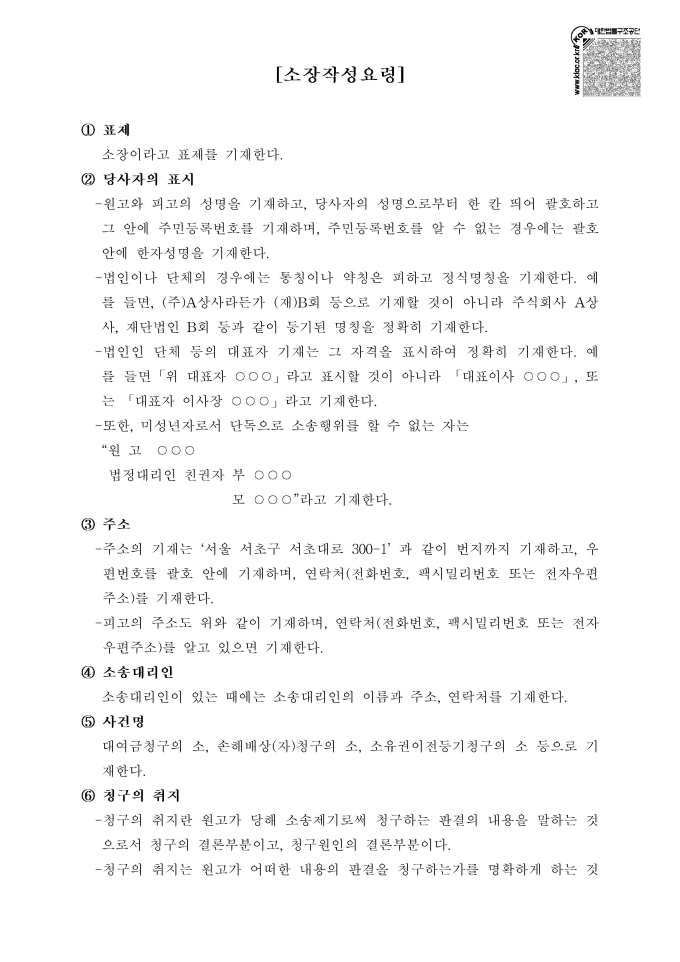 9,000원/월소장의 작성방법 서식입니다. 소장을 작성할 수 있는 샘플 서식과 소장 작성 요령이 기재되어 있습니다. 소장에 기재해야 하는 필수 기재사항은 다음과 같습니다. ([민사소송법] 제249조 및 제274조제1항). ○ 당사자의 성명·명칭 또는 상호와 주소 ○ 법정대리인의 성명과 주소 ○ 사건의 표시 ○ 청구 취지 ○ 청구 원인 ○ 덧붙인 서류의 표시 ○ 작성한 날짜 ○ 법원의 표시 ○ 청구취지 ※ 출처 : 대한법률구조공단 https://www.klac.or.kr/legalinfo/legalFrm.do