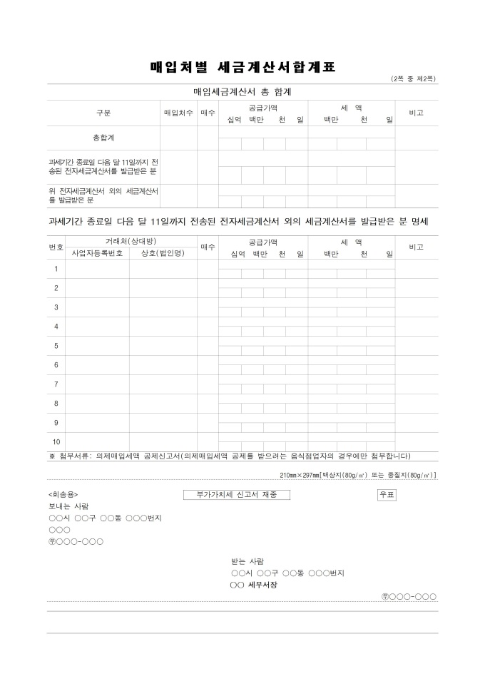 9,000원/월간이과세자 부가가치세 간편 신고서(부동산임대업종 외 사업자용), 매입처별 세금계산서합계표 서식입니다. 이 신고서는 간이과세사업자(부동산임대업자 제외)를 위한 간편 신고서입니다. [별지 제46호서식]