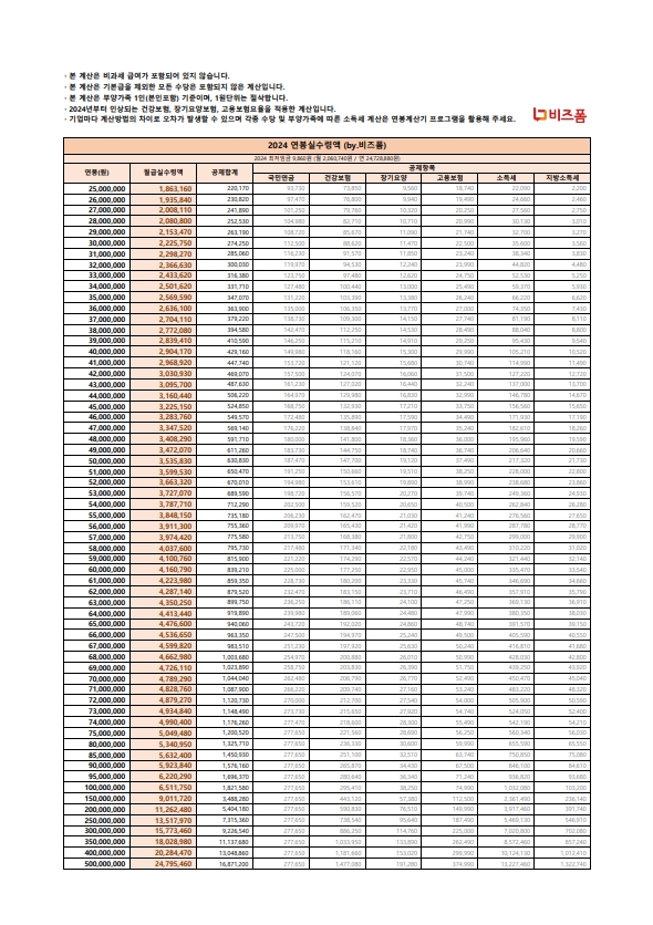 2024년 연봉 실수령액표 서식입니다. 연봉을 기준으로 실질적으로 수령하게 되는 금액을 나타낸 표로 연봉 협상 시 또는 재정 계획을 세울 때 매우 유용하게 사용됩니다.