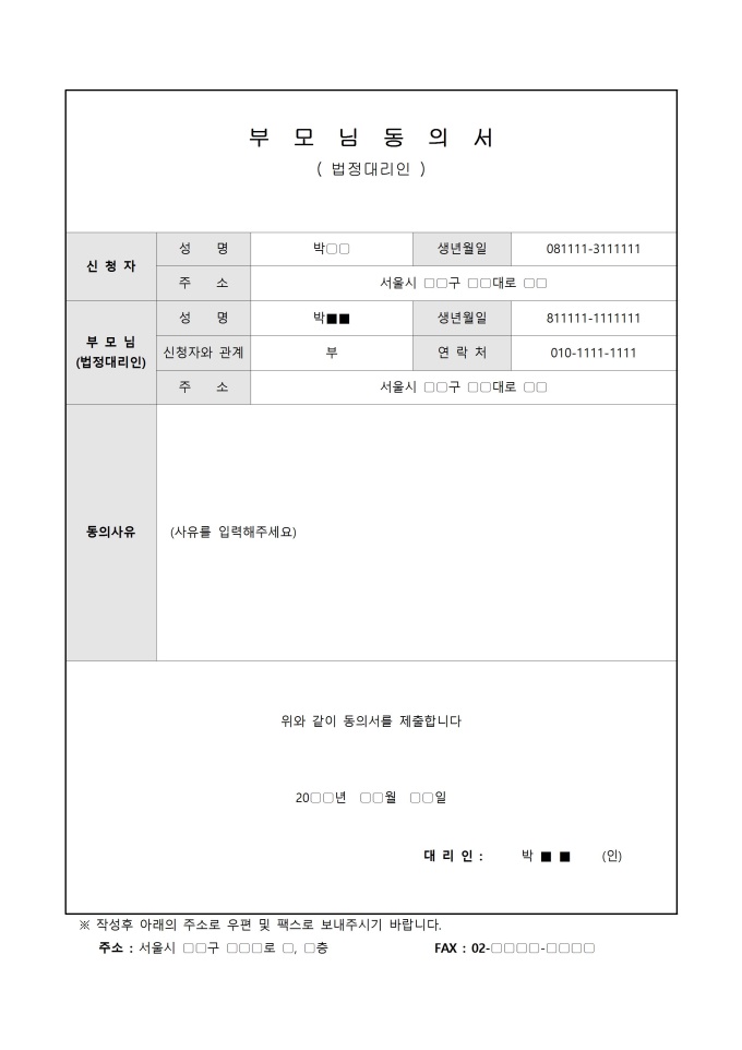 9,000원/월보호자 동의서(법정대리인, 아르바이트) 서식입니다. 보호자 동의서(법정대리인, 아르바이트)는 미성년자가 아르바이트를 하기 위해 필요한 서식 중 하나입니다. 이 서식은 미성년자가 아르바이트를 하는 것에 대해 법정대리인(보통 부모 또는 법적 보호자)의 동의를 받았음을 증명하기 위해 사용됩니다.