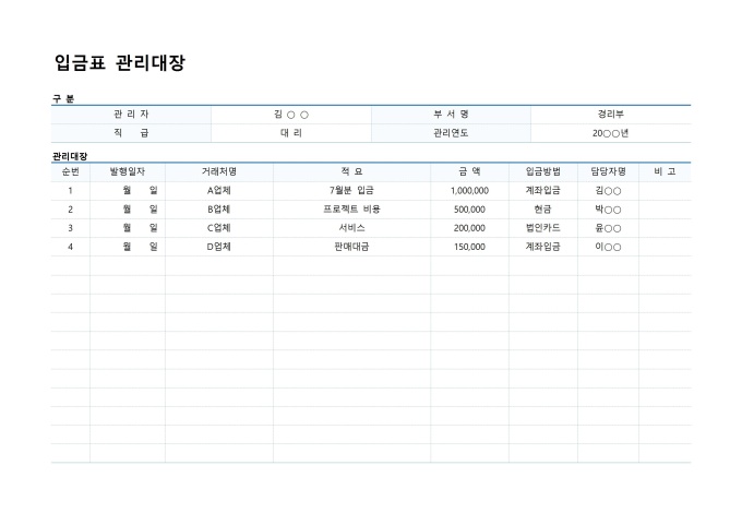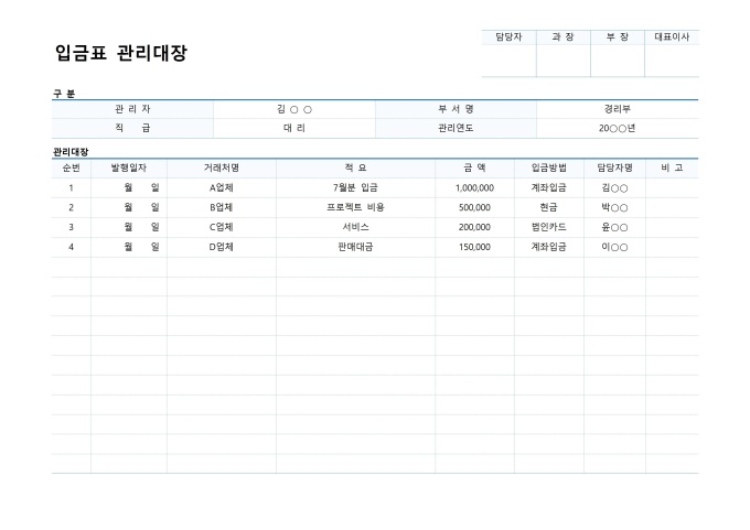 9,000원/월입금표 관리대장 서식입니다. 입금표 관리대장은 기관이나 회사에서 현금 등 입금 내역을 체계적으로 관리하기 위해 사용하는 문서입니다. 특히 회계 관리나 세무 관리에 필요한 근거 자료로 활용할 수 있습니다.