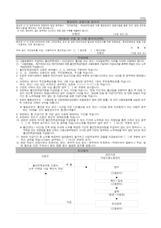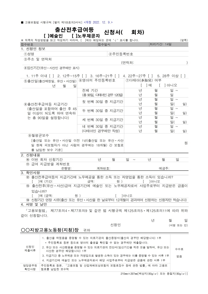 9,000원/월출산전후급여등 (예술인, 노무제공자) 신청서 서식입니다. 「고용보험법」 제77조의4ㆍ제77조의9 및 같은 법 시행규칙 제125조의5ㆍ제125조의11에 따라 출산전후급여 (예술인, 노무제공자) 신청시 사용되는 서식입니다. 고용보험법 시행규칙 [별지 제105호의3서식]